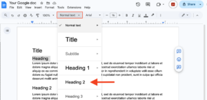 Click into the dropdown menu on the toolbar that reads “Normal text.” If there is already a heading in place, this box might have a different label. - Headings should form an outline of the content of your assignment or handout, so choose the heading that corresponds to the structure of your assignment or handout. Main headings (e.g., “Instructions,” “Expectations”) should use Heading 1.
