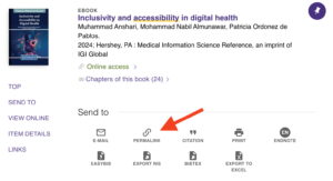 - Use the permalink when sharing information about the e-book with students. Unlike the link in your search bar, which may be specific to your search and log in information, this stable link will provide your students with consistent access to the resource.